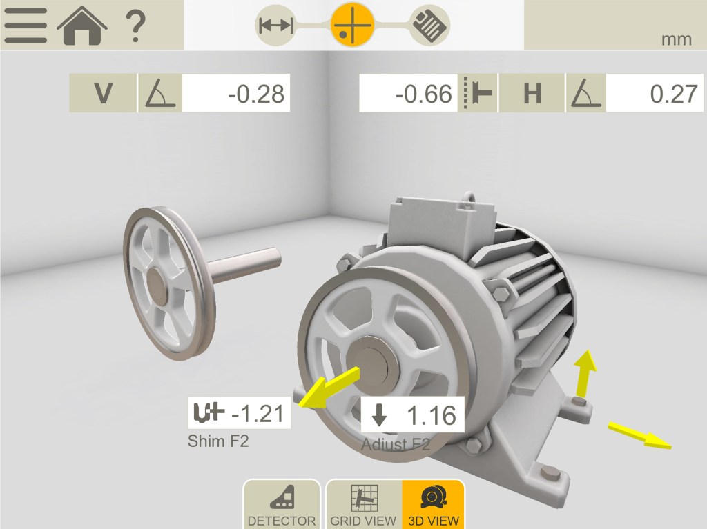 El transmisor genera un plano láser paralelo a la polea de referencia. El detector lee la posición respecto al plano láser y muestra en pantalla, en tiempo real, los valores angular y de desviación. De este modo, la alineación de las máquinas ajustables resulta muy sencilla. Además, gracias a la precisión de la lectura digital, podrá alinear dentro de las tolerancias especificadas y confiar en los resultados.